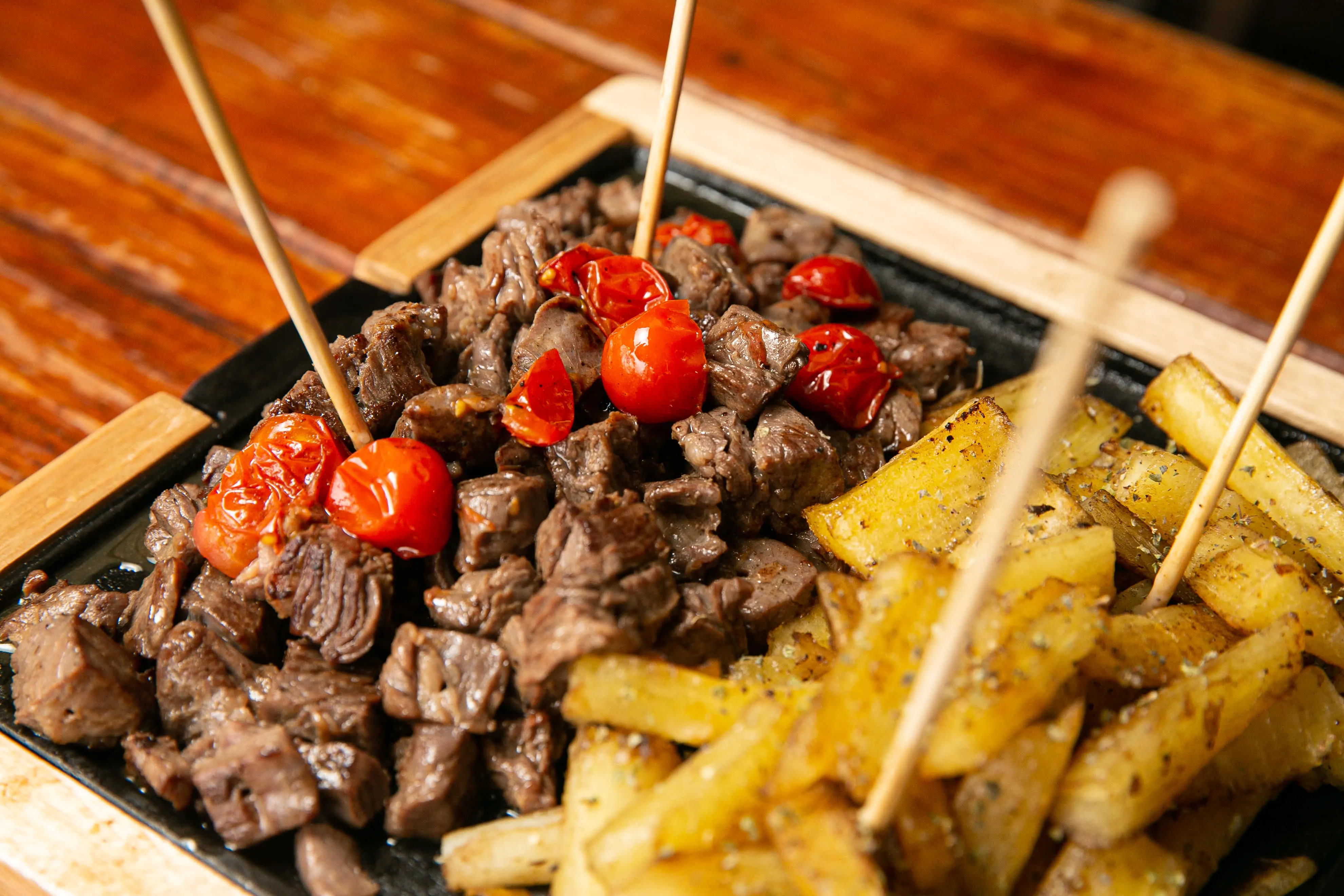 Nossa chapa Mais pedida. Iscas de Carne de Gado, Filé Mignon Suíno, Coração de Frango acompanhados de Calabresinha, Pimentão e Cebola em Cubos, 2 Pães de Alho assados, Queijo Mussarela e Tempero Verde.