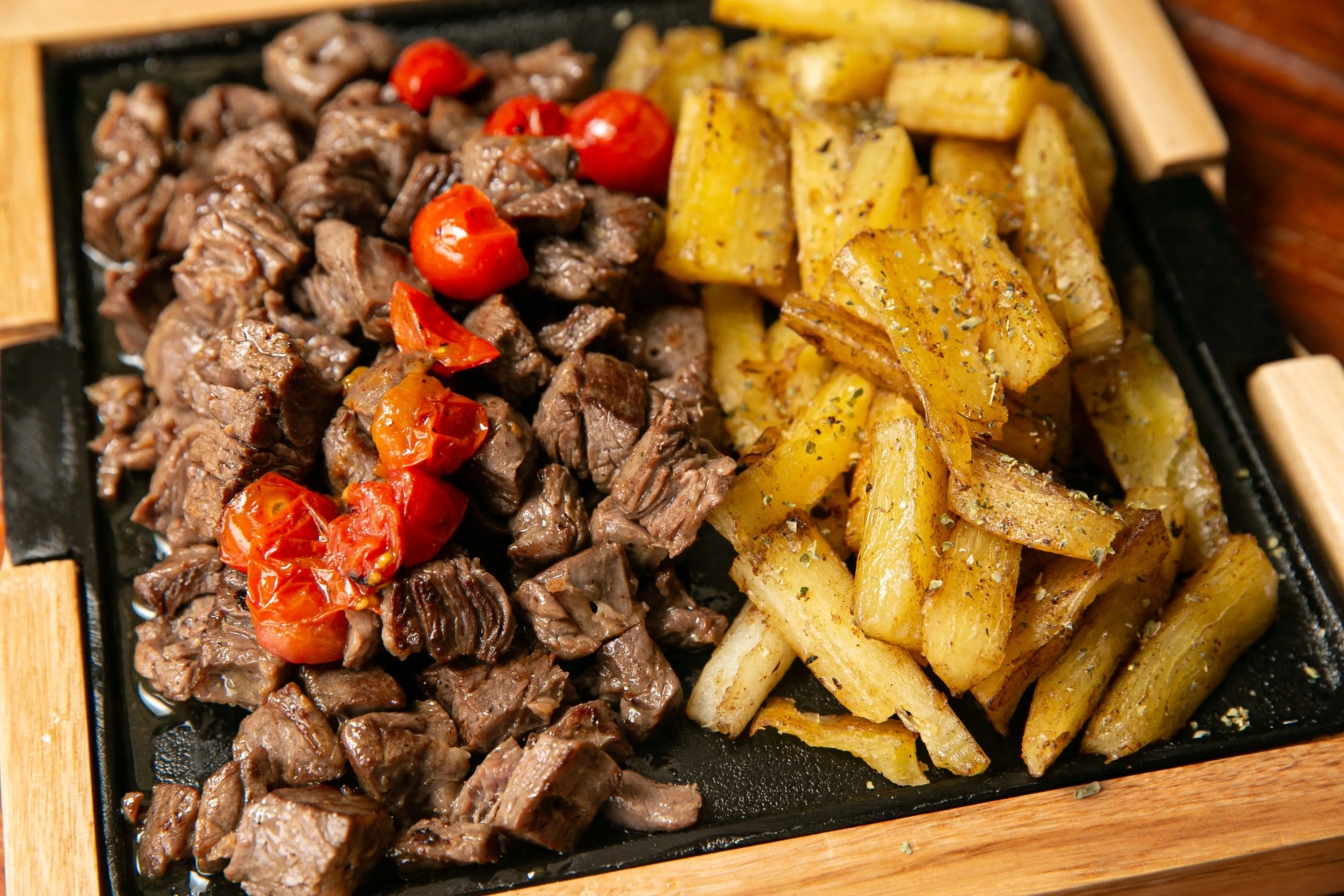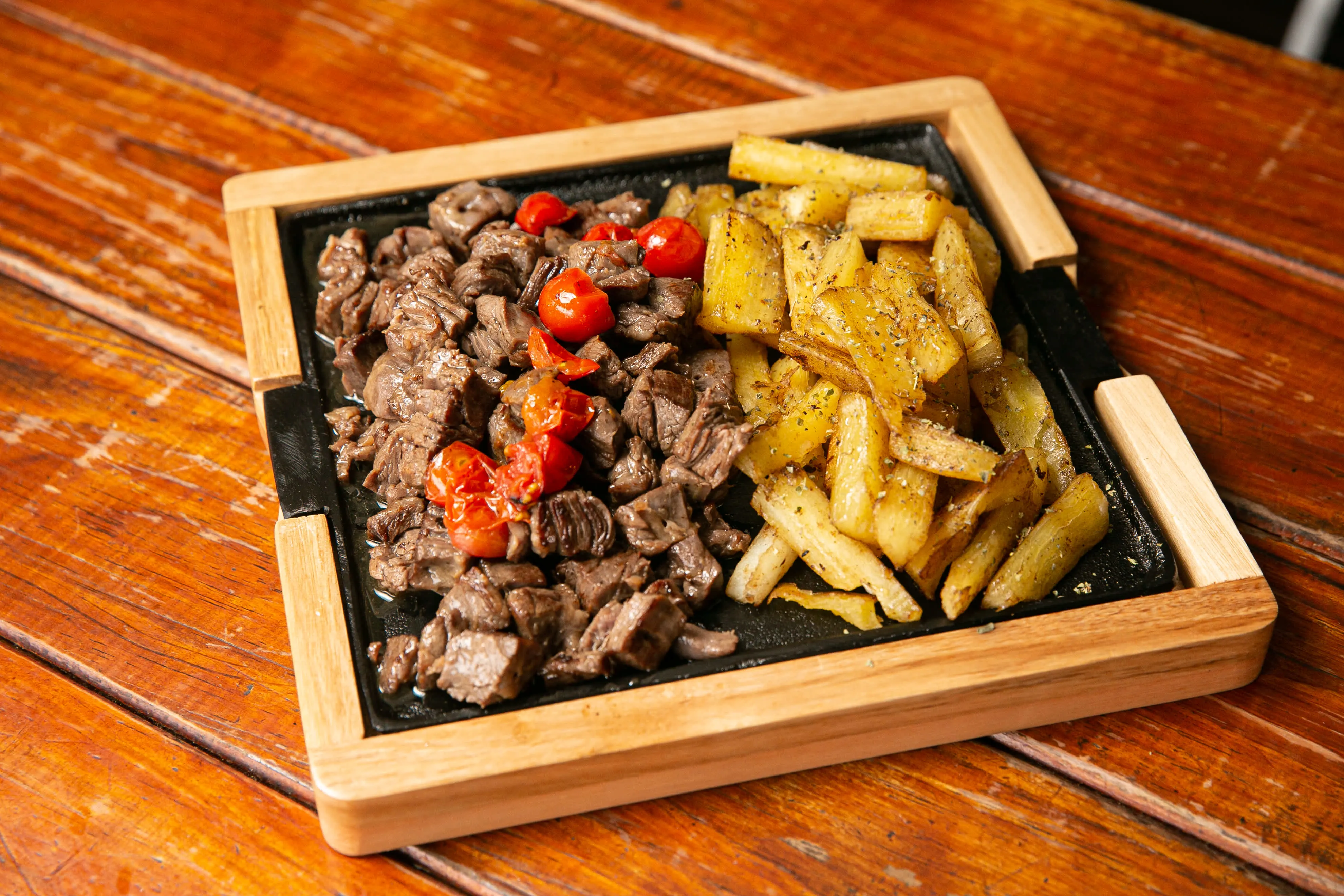 O clássico corte Argentino Entranha feito na Chapa (500g) acompanhados de Tomate Cereja, Mandioca Frita e Tempero Verde.