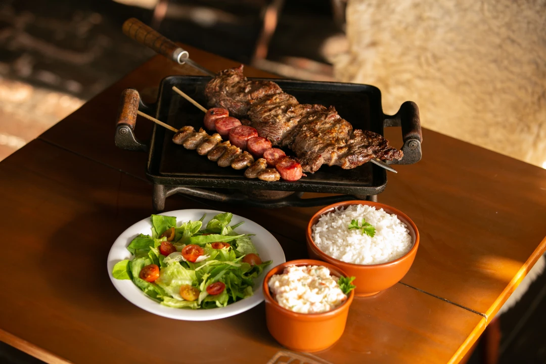 1 espeto (aprox. 550g) de Entrecot, arroz, salada de maionese, salada verde, 1 espetinho toscana e 1 espetinho de coração.