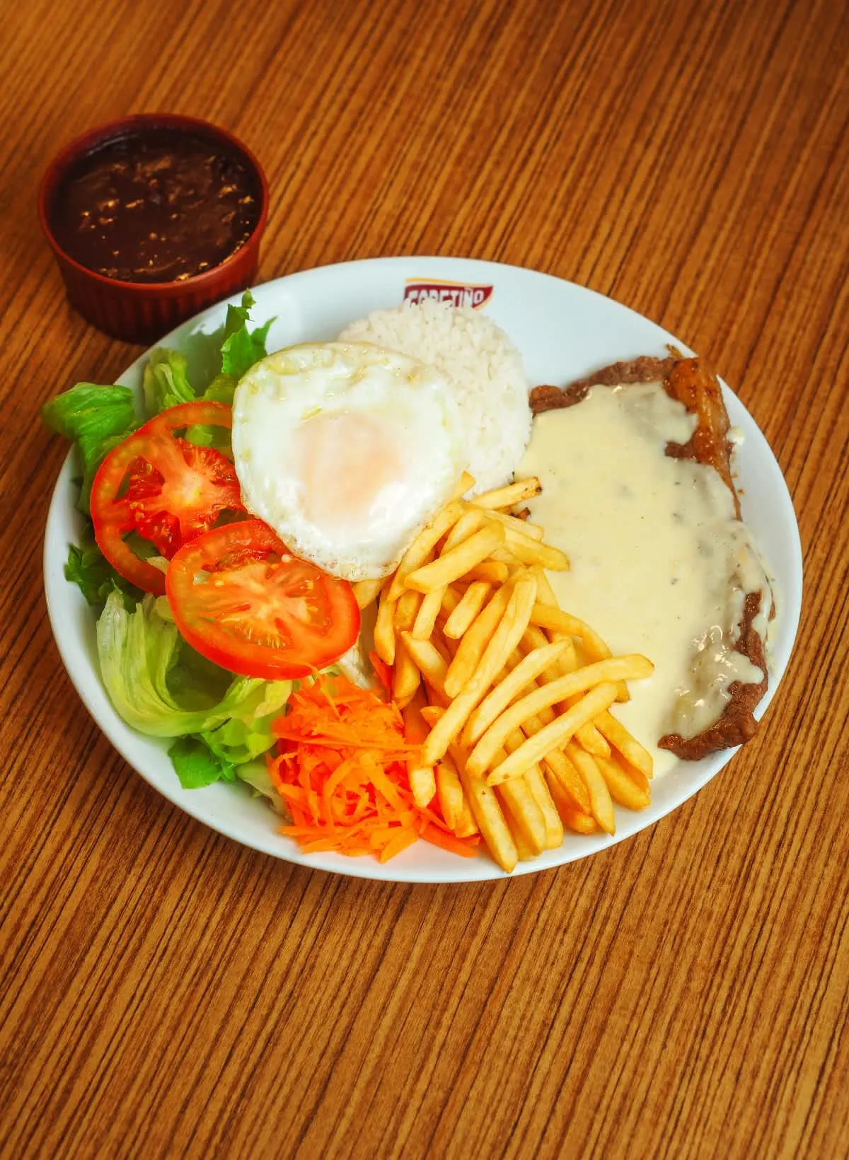 Bife Bovino (120g) feito na chapa com um delicioso Molho de Queijo receita da Casa, acompanhados de Arroz, Feijão, Ovo Frito, Batata Frita e Mix de Salada.