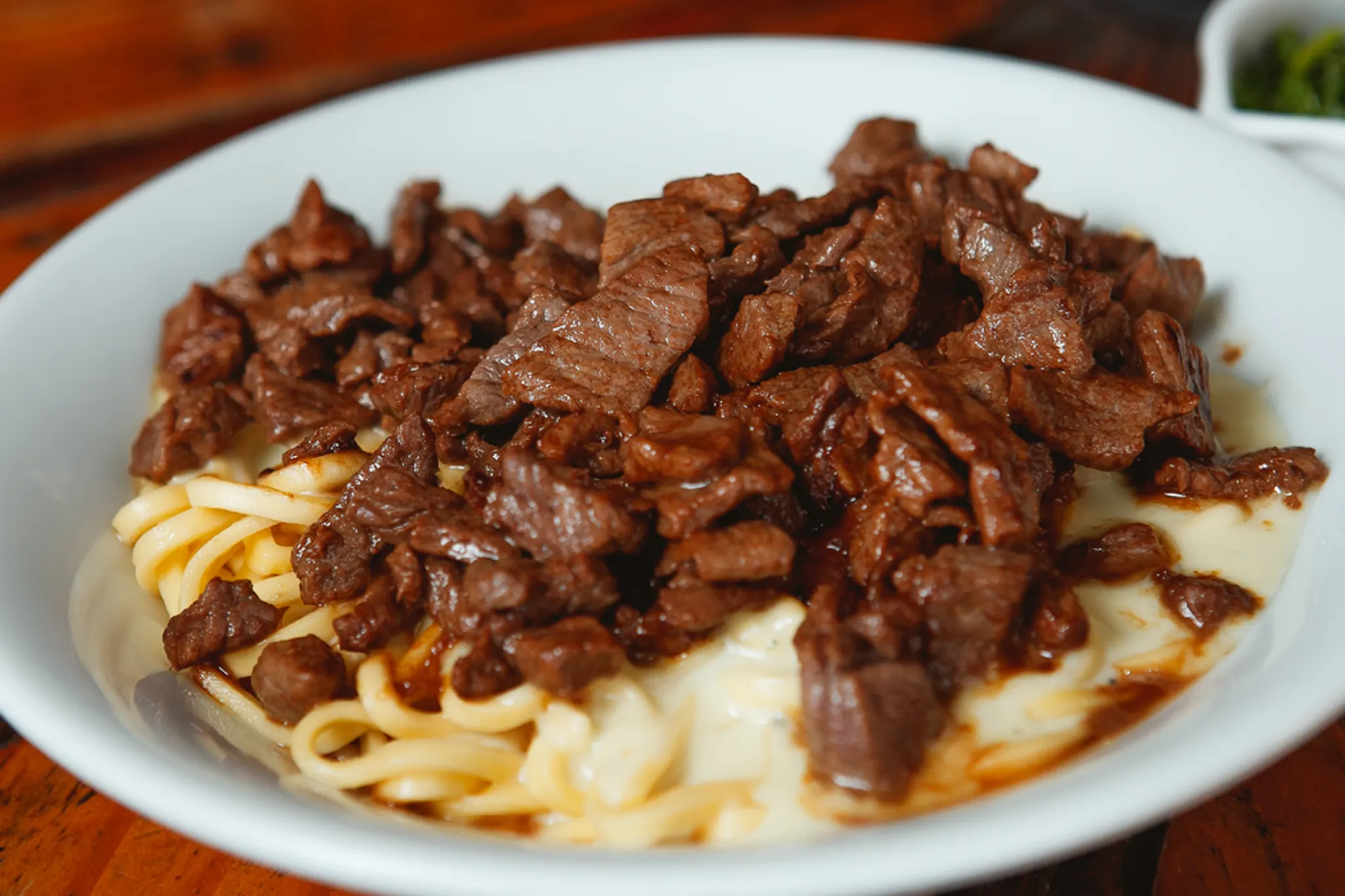 O queridinho da casa! Um Talharim coberto com Molho de Queijo e Iscas de Carne.